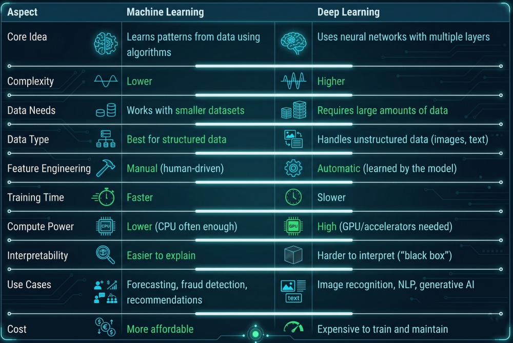 The moment you choose between deep learning vs machine learning, you’re not picking a buzzword. You’re choosing: